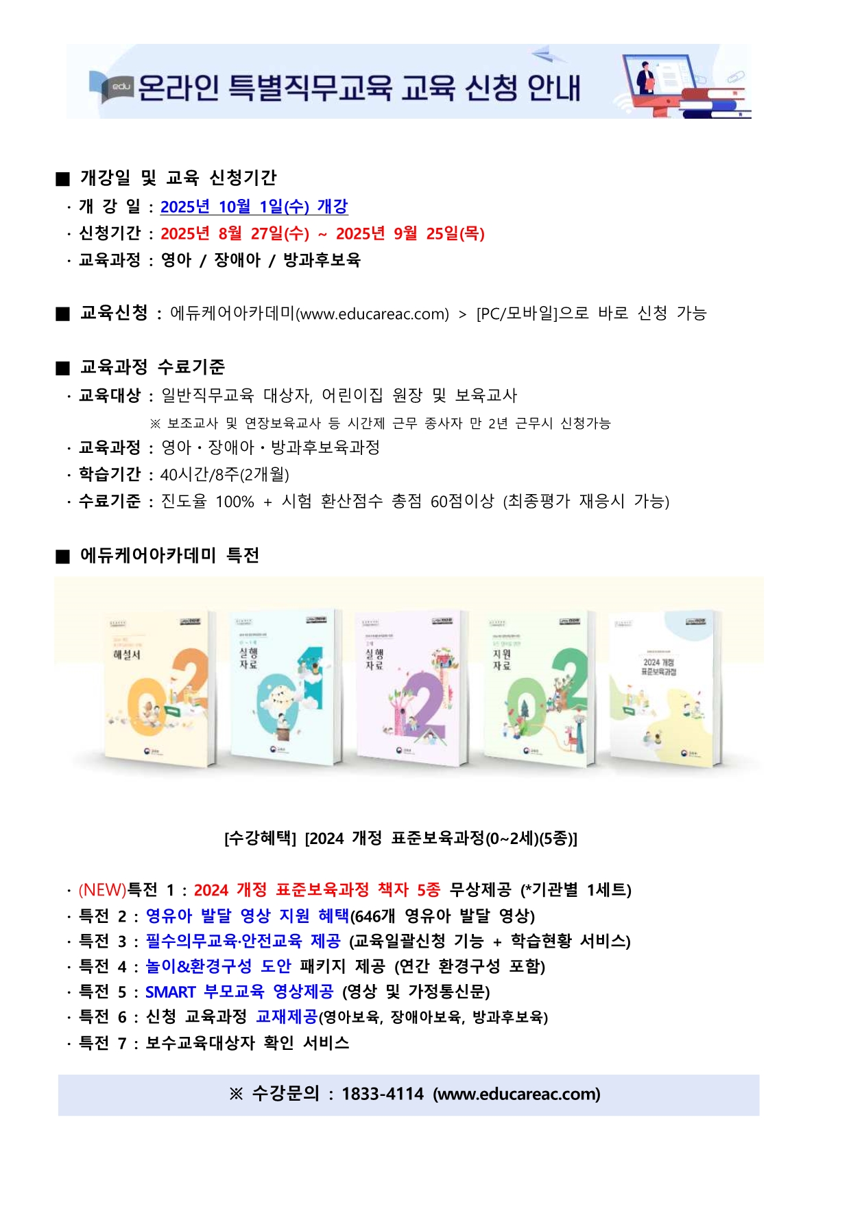 [에듀케어아카데미] 보육교직원 온라인 특별직무교육 2025년 10월 개강 교육신청