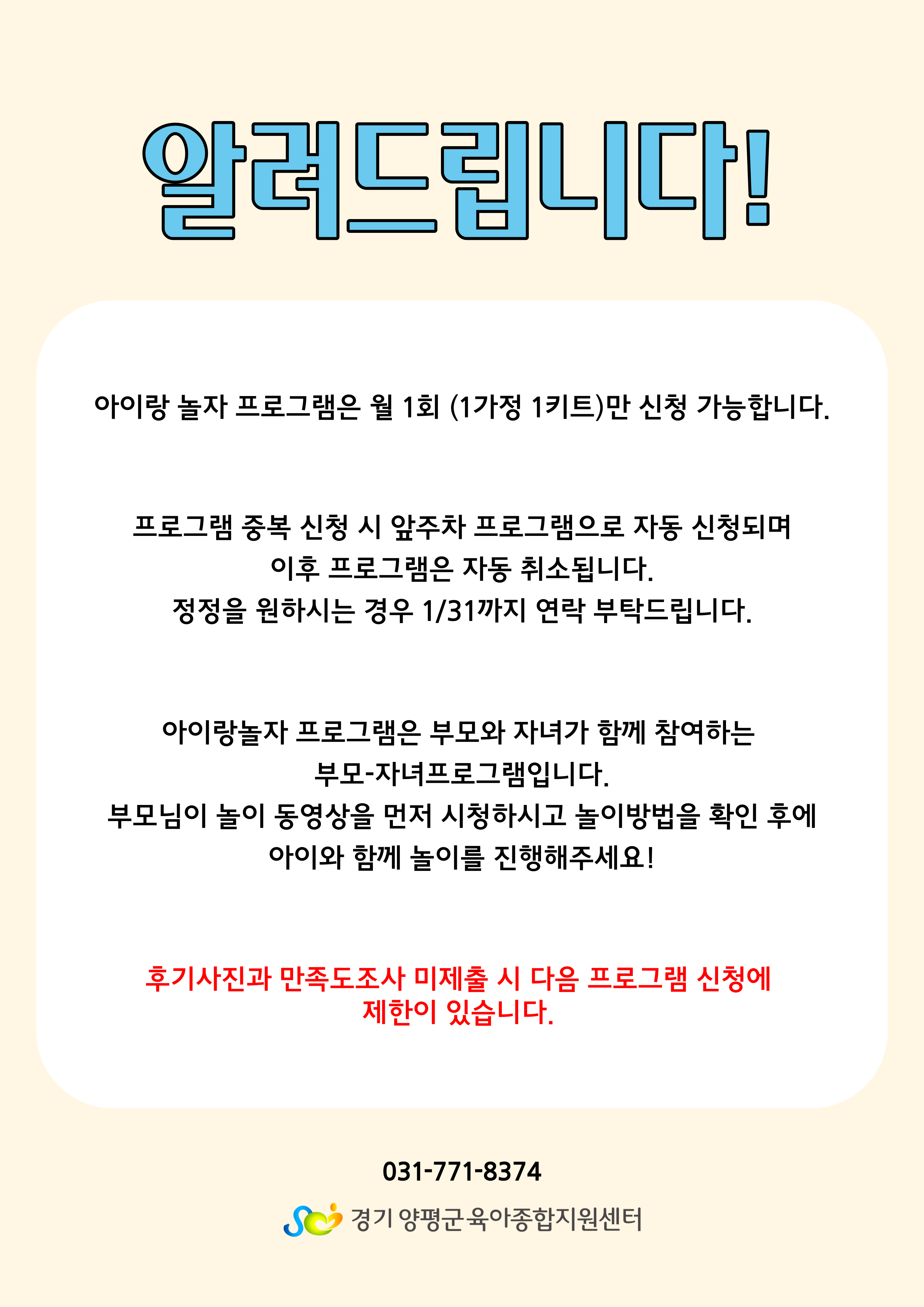 | 기타사항 | * 비고란에 수령처(예, 양서점, 양평점) 적어주시기 바랍니다. !!미기재 시 양서점으로 자동 수령처가 됩니다.!! * [꼭 ~ 읽어 주세요] 를 필독 바랍니다. -1가정 1키트 방식입니다. 자녀는 1명만 선택해주세요. - 만족도 설문지와 사진 후기 미 제출 시 다음 프로그램 신청에 제한이 될 수 있습니다. <만족도 설문지 URL 접속 : 개인 휴대폰으로 전송> - 본인 실수로 인한 무효 처리는 책임지지 않습니다. [해당 프로그램 취소 방법은 031-771-8374번으로 연락 바랍니다.] |