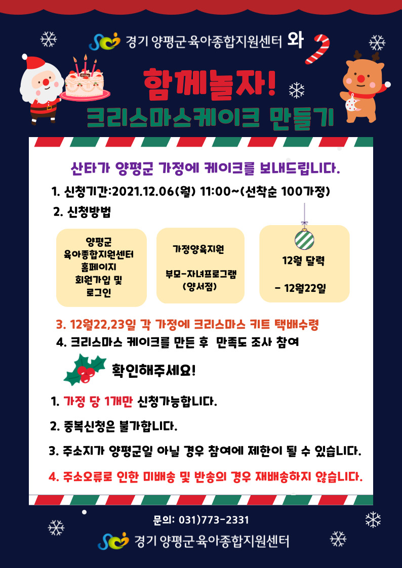 | 기타사항 | - 택배배송 예정이며 가입시 회원주소를 정확하게 기재해주세요. - 반송된 제품및 주소 오류로 인한 미배송건은 재배송이 어려우니 이 점 확인하시고 신청해주세요. - 각 가정에 1개만 신청가능하며 주소지 중복 시 1개만 배송됩니다. - 양평관내 주소지만 신청가능합니다. -비고란에 정확한 주소를 다시한번 기입해주세요. |