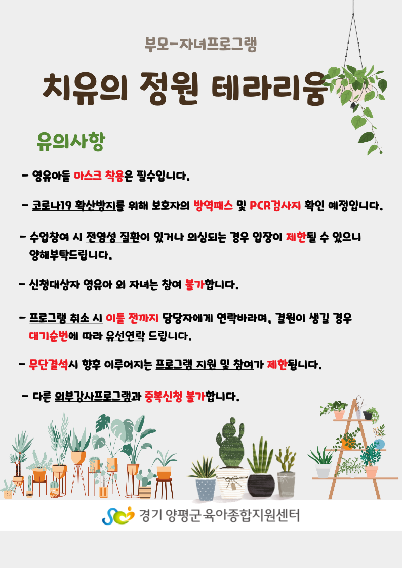 | 기타사항 | - 유아들 마스크 착용은 필수입니다. - 코로나19 확산방지를 위해 보호자의 방역패스 및 PCR검사지 확인 예정입니다. - 수업참여 시 전염성 질환이 있거나 의심되는 경우 입장이 제한될 수 있으니 양해부탁드립니다. - 신청대상자 유아 외 자녀는 동반 불가합니다. - 결원이 생길 경우 대기 순번에 따라 유선연락 드립니다. - 프로그램 취소 시 이틀 전까지 담당자에게 연락바라며, 대리참석이 불가합니다. - 1회이상 무단결석 시 향후 이루어지는 프로그램에 지원 및 참여가 제한됩니다. - 다른 외부강사프로그램과 중복하여 신청할 수 없습니다. |