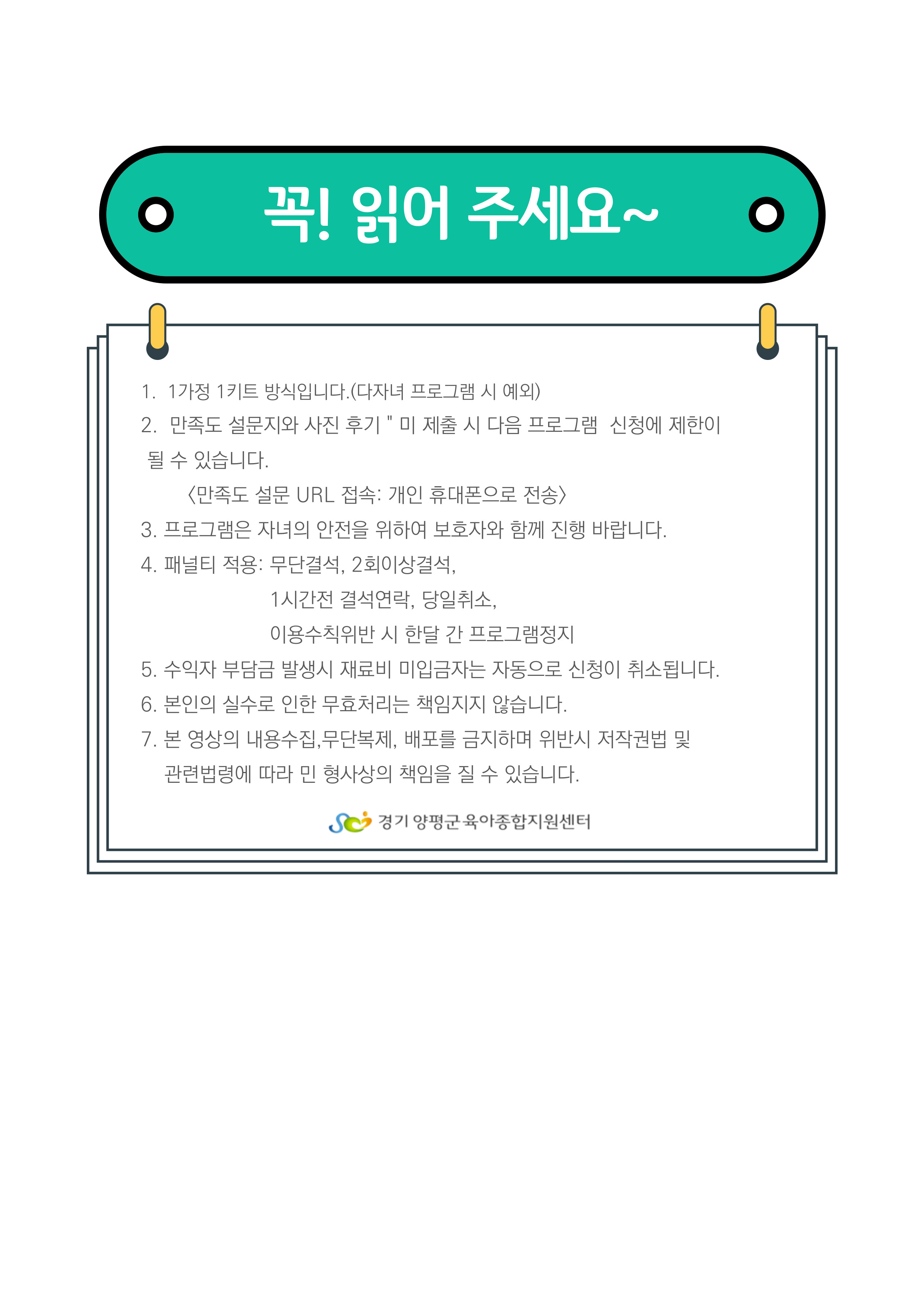 | 기타사항 | * [꼭 ~ 읽어 주세요] 를 필독 바랍니다. -1가정 1키트 방식입니다. - 만족도 설문지와 사진 후기 미 제출 시 다음 프로그램 신청에 제한이 될 수 있습니다. <만족도 설문지 URL 접속 : 개인 휴대폰으로 전송> - 패널 티 관련 - 본인 실수로 인한 무효 처리는 책임지지 않습니다. - 본 영상의 저작권 관련 [해당 프로그램 취소 방법은 773-2331(내선3)으로 연락 바랍니다.] |