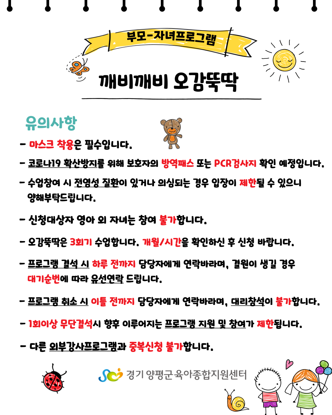 - 프로그램 결석 시 하루 전까지 담당자에게 연락바라며, 결원이 생길 경우 대기 순번에 따라