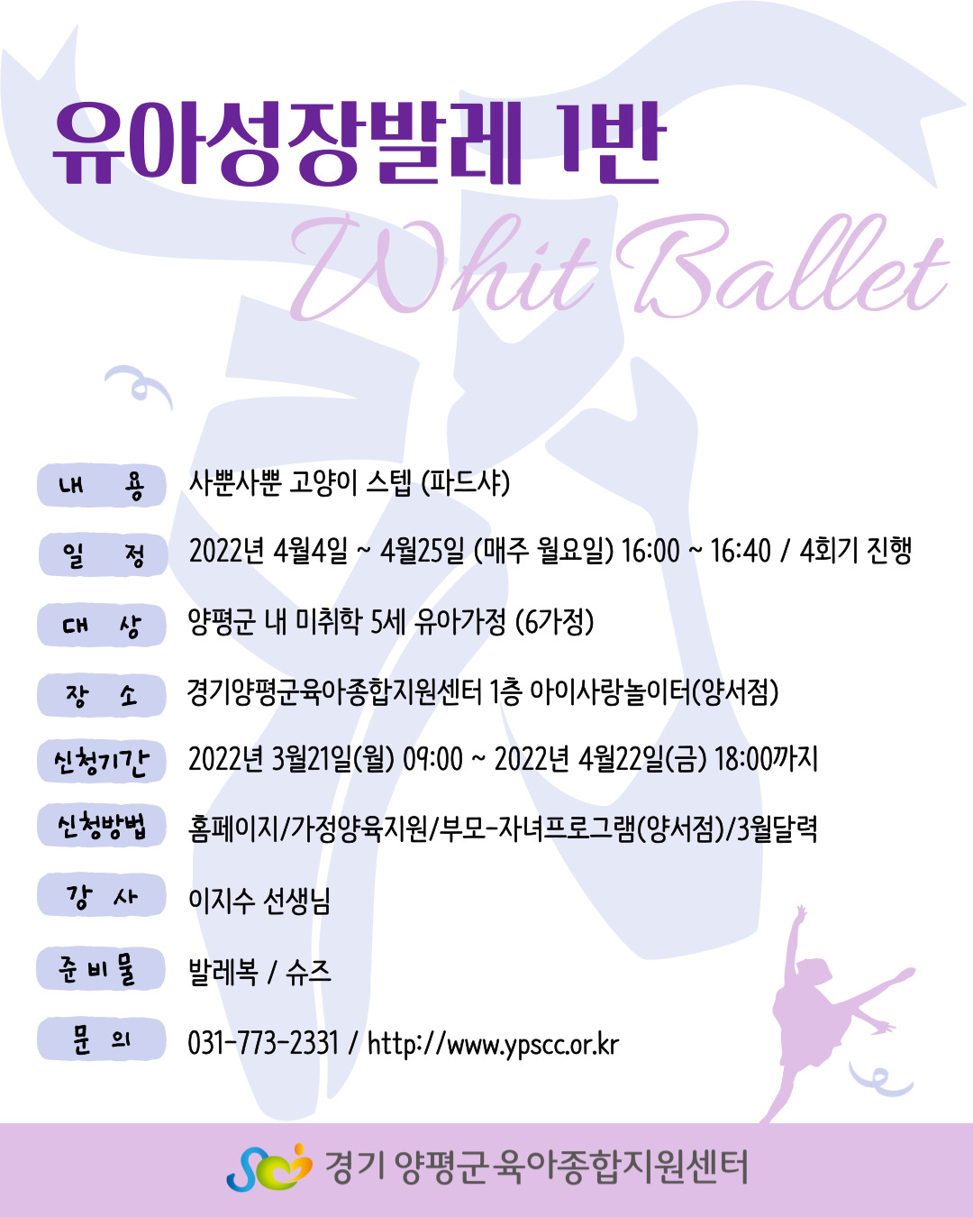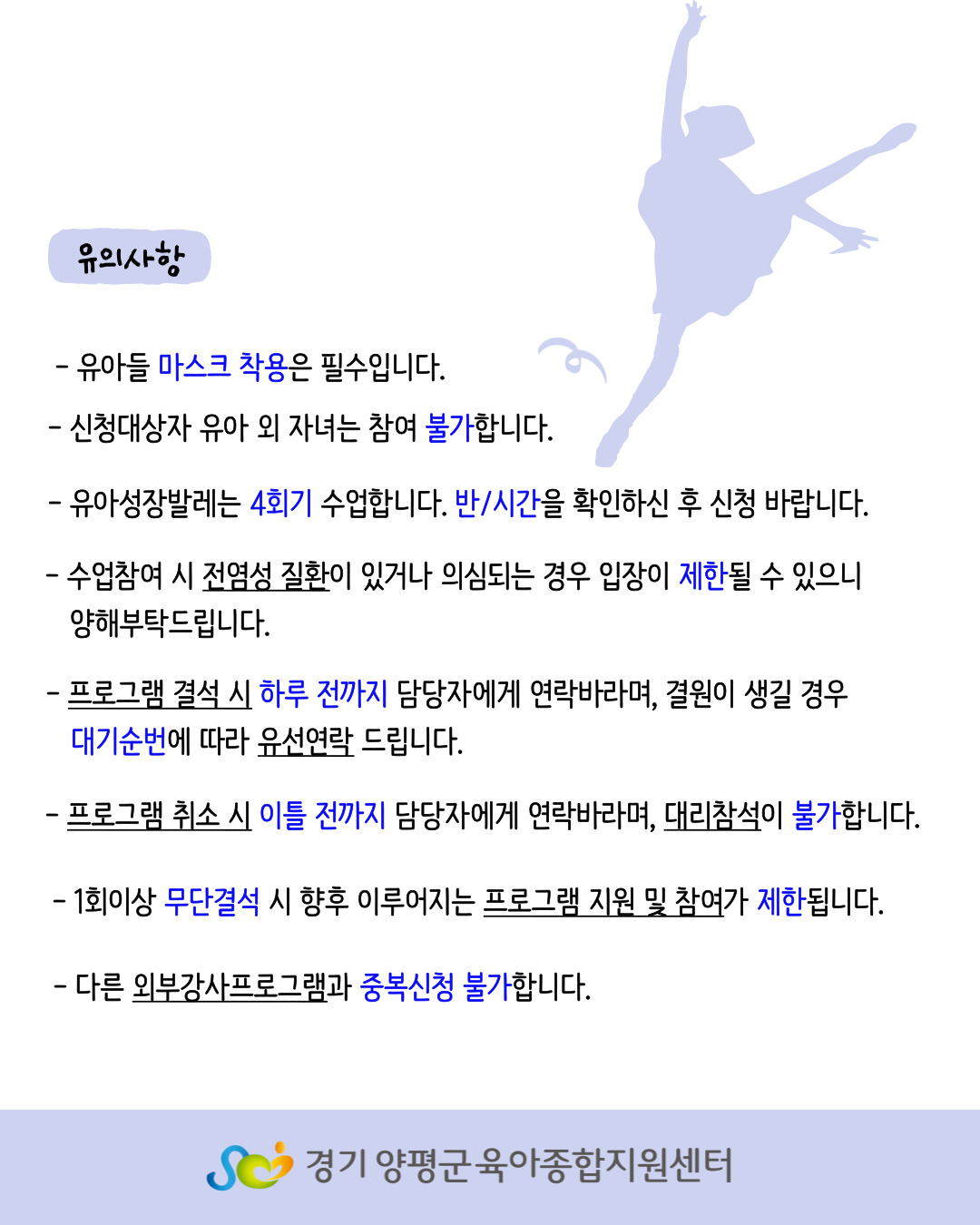- 유아성장발레는 4회기 수업합니다. 반/시간을 확인하신 후 신청 바랍니다.