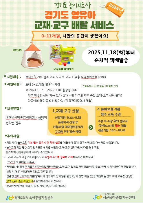 기타사항 | *25년도 영유아 교재교구 배달 서비스 마지막 차수로 선착순 모집입니다. *출생년도를 확인 후 신청해주시기 바랍니다. |