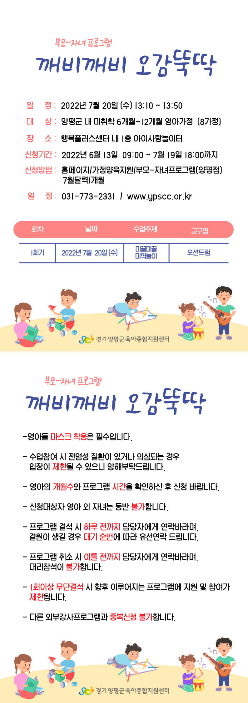 | 기타사항 | - 영아들 마스크 착용은 필수입니다. - 수업참여 시 전염성 질환이 있거나 의심되는 경우 입장이 제한될 수 있으니 양해부탁드립니다. - 영아의 개월수와 프로그램 시간을 확인하신 후 신청 바랍니다. - 신청대상자 영아 외 자녀는 동반 불가합니다. - 프로그램 결석 시 하루 전까지 담당자에게 연락바라며, 결원이 생길 경우 대기 순번에 따라 유선연락 드립니다. - 프로그램 취소 시 이틀 전까지 담당자에게 연락바라며, 대리참석이 불가합니다. - 1회이상 무단결석 시 향후 이루어지는 프로그램에 지원 및 참여가 제한됩니다. - 다른 외부강사프로그램과 중복하여 신청할 수 없습니다. |