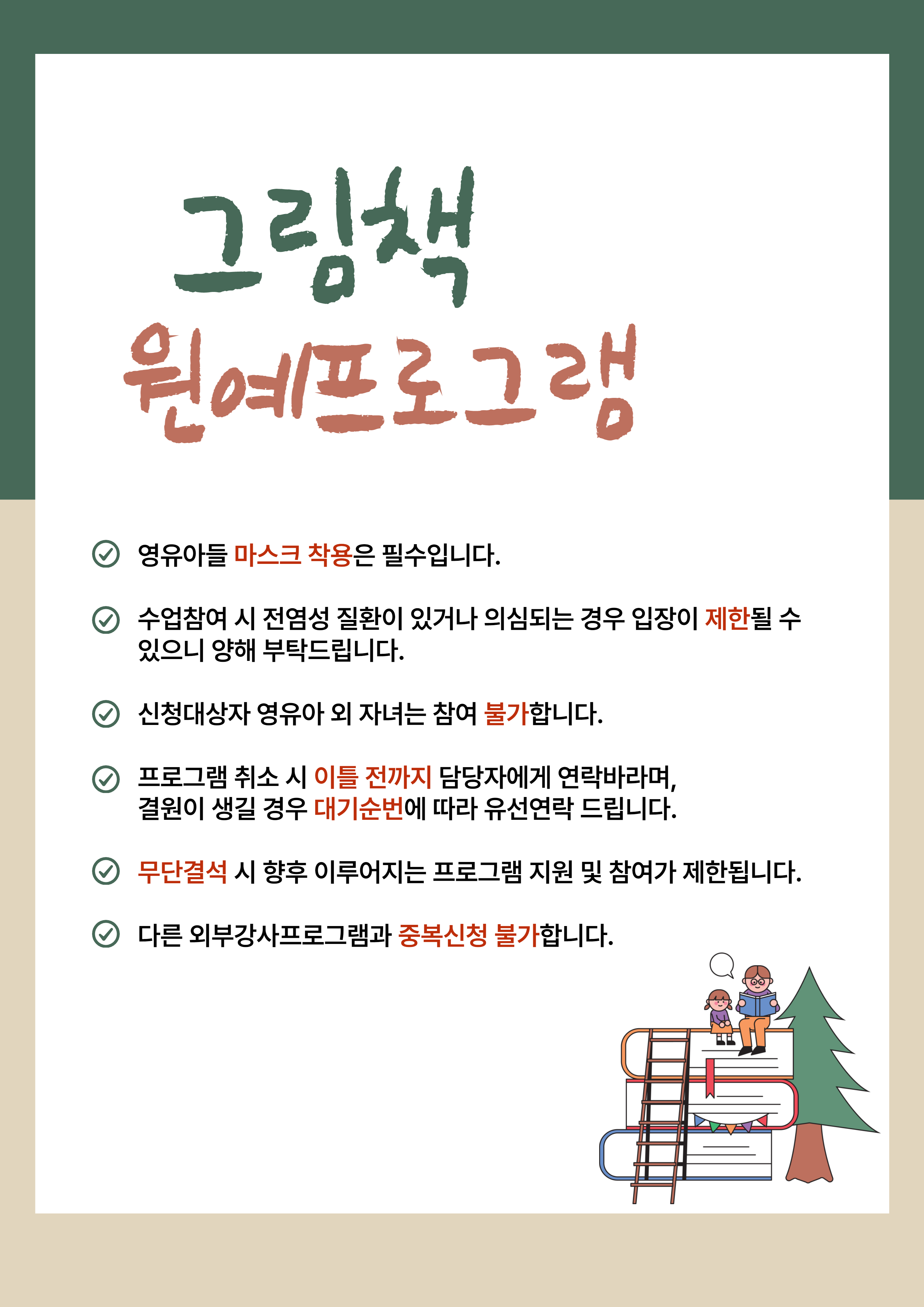 | 기타사항 | - 유아들 마스크 착용은 필수입니다. - 수업참여 시 전염성 질환이 있거나 의심되는 경우 입장이 제한될 수 있으니 양해부탁드립니다. - 유아의 연령과 프로그램 시간을 확인하신 후 신청 바랍니다. - 신청대상자 유아 외 자녀는 동반 불가합니다. - 보호자는 한명만 참석 가능합니다. - 프로그램 결석 시 하루 전까지 담당자에게 연락바라며, 결원이 생길 경우 대기 순번에 따라 유선연락 드립니다. - 프로그램 취소 시 이틀 전까지 담당자에게 연락바라며, 대리참석이 불가합니다. - 1회이상 무단결석 시 향후 이루어지는 프로그램에 지원 및 참여가 제한됩니다. - 다른 외부강사프로그램과 중복하여 신청할 수 없습니다. |