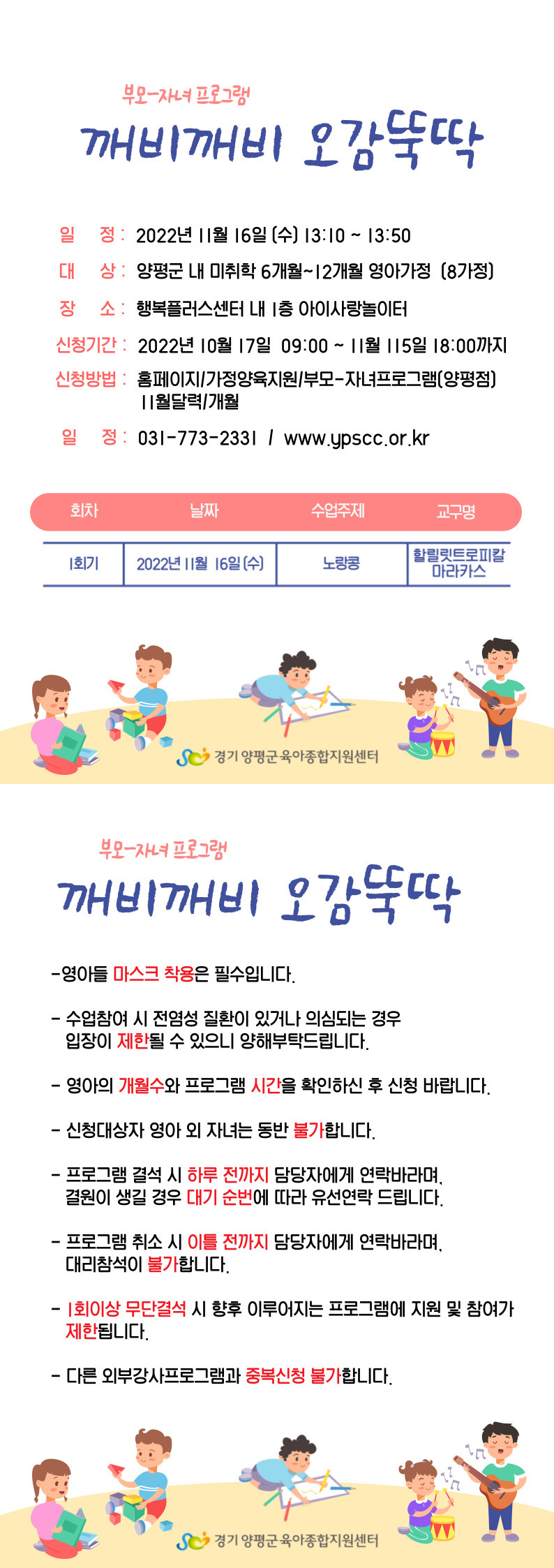 | 기타사항 | - 영아들 마스크 착용은 필수입니다. - 수업참여 시 전염성 질환이 있거나 의심되는 경우 입장이 제한될 수 있으니 양해부탁드립니다. - 영아의 개월수와 프로그램 시간을 확인하신 후 신청 바랍니다. - 신청대상자 영아 외 자녀는 동반 불가합니다. - 보호자는 한명만 참석 가능합니다. - 프로그램 결석 시 하루 전까지 담당자에게 연락바라며, 결원이 생길 경우 대기 순번에 따라 유선연락 드립니다. - 프로그램 취소 시 이틀 전까지 담당자에게 연락바라며, 대리참석이 불가합니다. - 1회이상 무단결석 시 향후 이루어지는 프로그램에 지원 및 참여가 제한됩니다. - 다른 외부강사프로그램과 중복하여 신청할 수 없습니다. |