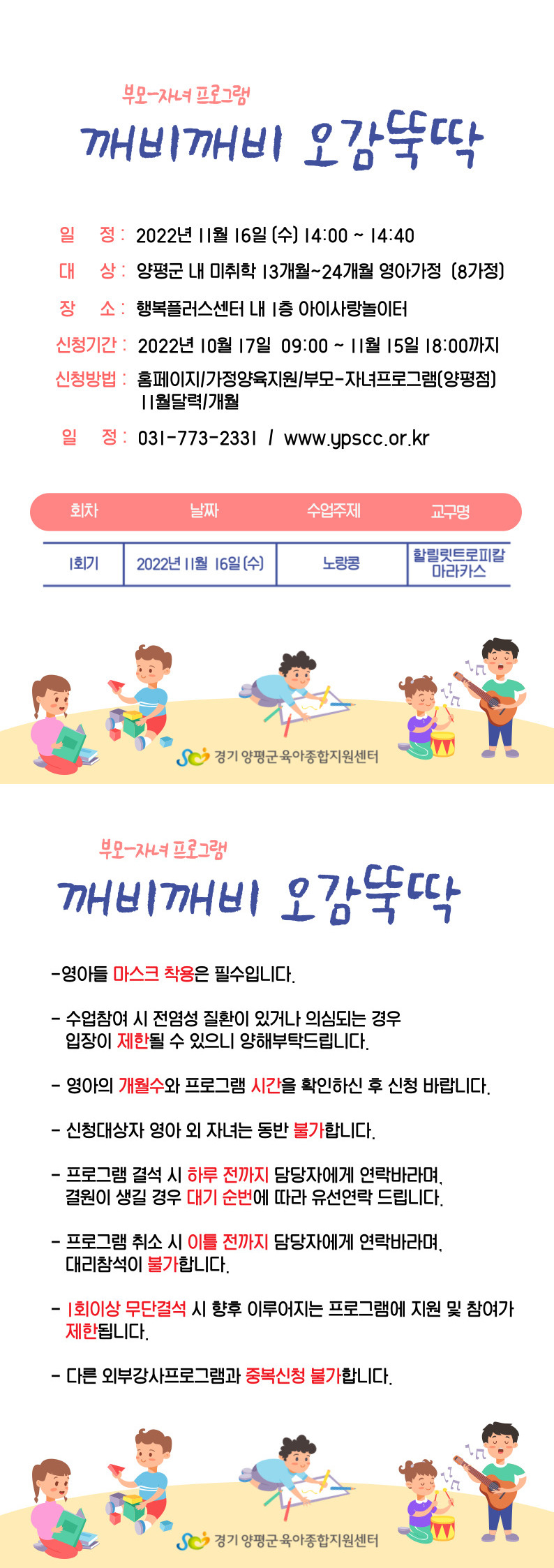 | 기타사항 | - 영아들 마스크 착용은 필수입니다. - 수업참여 시 전염성 질환이 있거나 의심되는 경우 입장이 제한될 수 있으니 양해부탁드립니다.? - 영아의 개월수와 프로그램 시간을 확인하신 후 신청 바랍니다. - 신청대상자 영아 외 자녀는 동반 불가합니다. - 보호자는 한명만 참석 가능합니다. - 프로그램 결석 시 하루 전까지 담당자에게 연락바라며, 결원이 생길 경우 대기 순번에 따라 유선연락 드립니다. - 프로그램 취소 시 이틀 전까지 담당자에게 연락바라며, 대리참석이 불가합니다. - 1회이상 무단결석 시 향후 이루어지는 프로그램에 지원 및 참여가 제한됩니다. - 다른 외부강사프로그램과 중복하여 신청할 수 없습니다. |