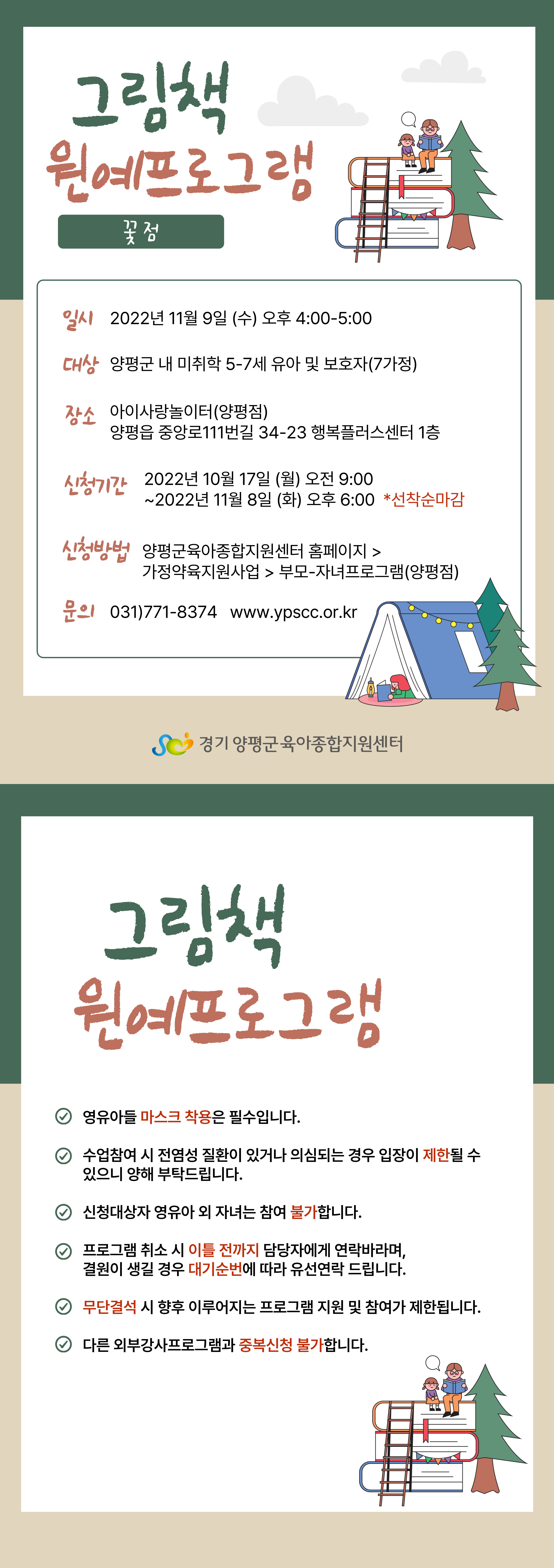 | 기타사항 | - 유아들 마스크 착용은 필수입니다. - 수업참여 시 전염성 질환이 있거나 의심되는 경우 입장이 제한될 수 있으니 양해부탁드립니다. - 유아의 연령과 프로그램 시간을 확인하신 후 신청 바랍니다. - 신청대상자 유아 외 자녀는 동반 불가합니다. - 보호자는 한명만 참석 가능합니다. - 프로그램 결석 시 하루 전까지 담당자에게 연락바라며, 결원이 생길 경우 대기 순번에 따라 유선연락 드립니다. - 프로그램 취소 시 이틀 전까지 담당자에게 연락바라며, 대리참석이 불가합니다. - 1회이상 무단결석 시 향후 이루어지는 프로그램에 지원 및 참여가 제한됩니다. - 다른 외부강사프로그램과 중복하여 신청할 수 없습니다. |