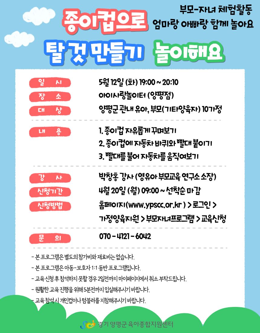 | 엄마랑 아빠랑 함께 놀아요 [종이컵으로 탈 것 만들기 놀이해요] 5세~7세 (저녁) | |||