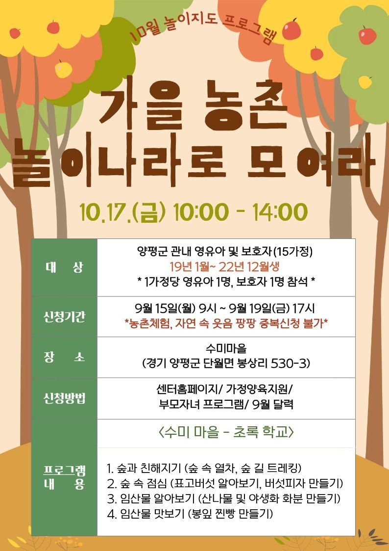 기타사항 | *농촌체험 및 숲 활동 프로그램으로 만2세-만5세 대상입니다. | ||
