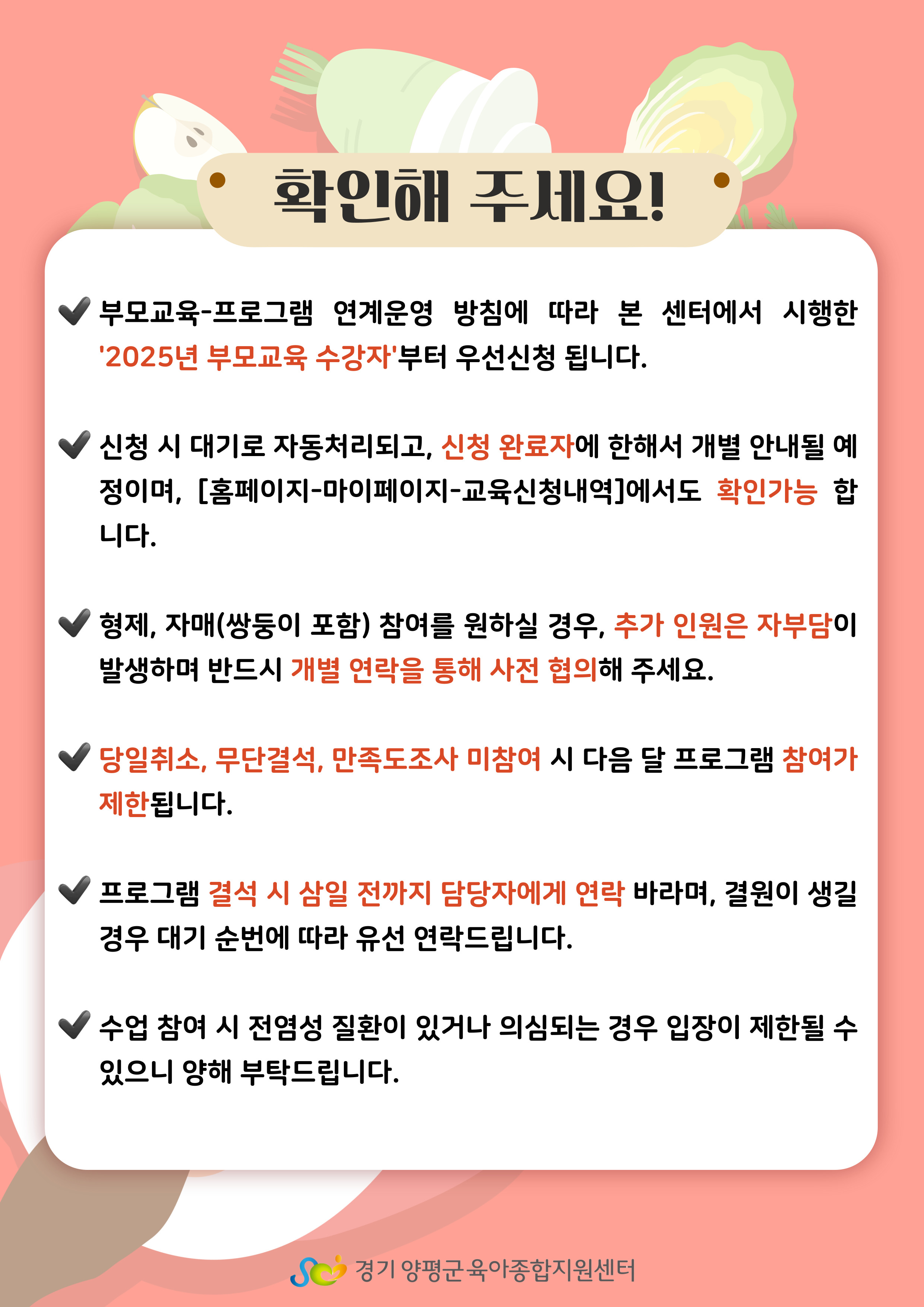 기타사항 본 프로그램은 [놀이지도사]김장 체험과 연계되어 진행되며, 두 프로그램 모두 신청하실 수 없습니다.