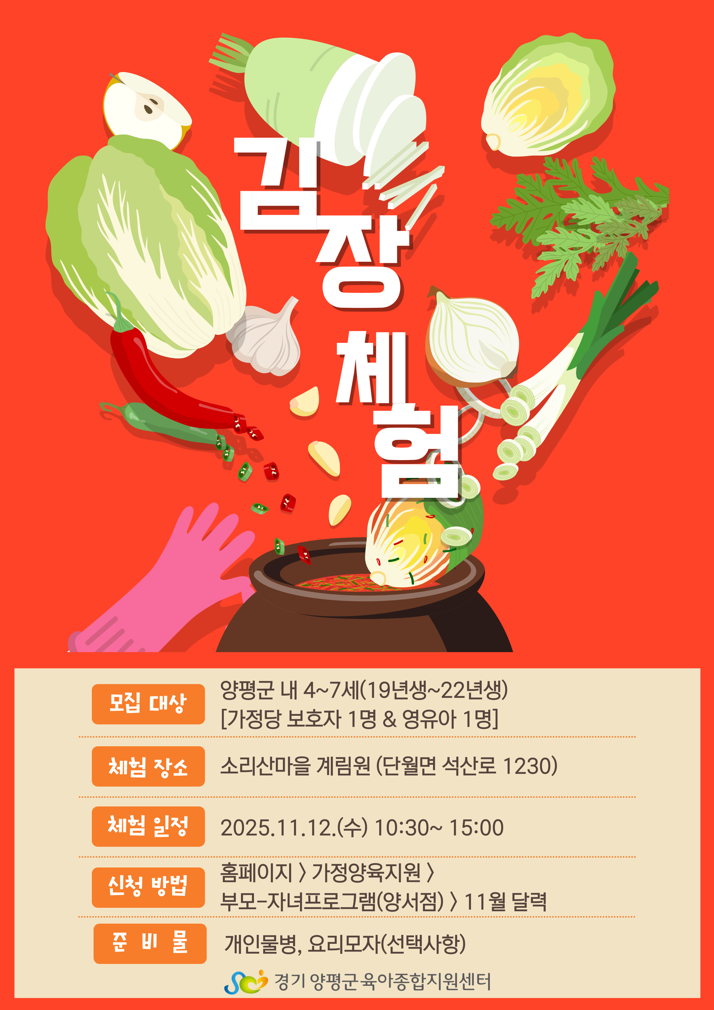 | 기타사항 | 본 프로그램은 [놀이지도사] 김치 나라로 모여라!와 연계되어 진행되므로 중복하여 신청하실 수 없습니다. | ||