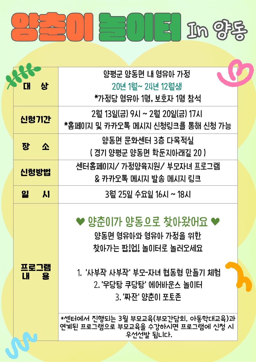 기타사항 *본 프로그램은 양동면 관내 영유아 신청 대상입니다.