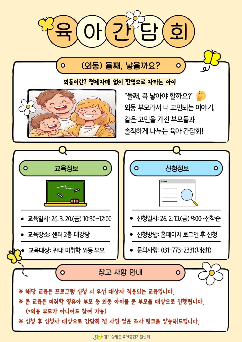 | 기타사항 | - 해당 교육은 프로그램 신청 시 우선 대상자 적용되는 교육입니다. - 교육 대상은 미취학 외동 가정의 양육자이나, 해당되지 않아도 교육을 수강하고 싶은 미취학 영유아 양육자는 신청 가능합니다. |