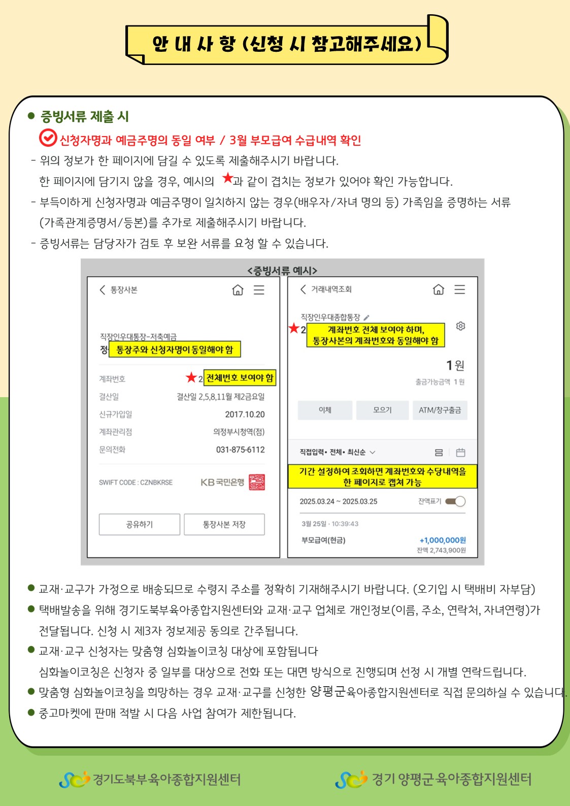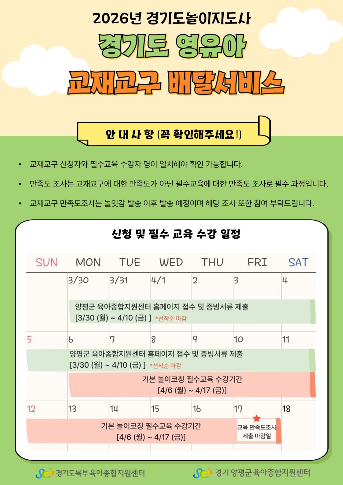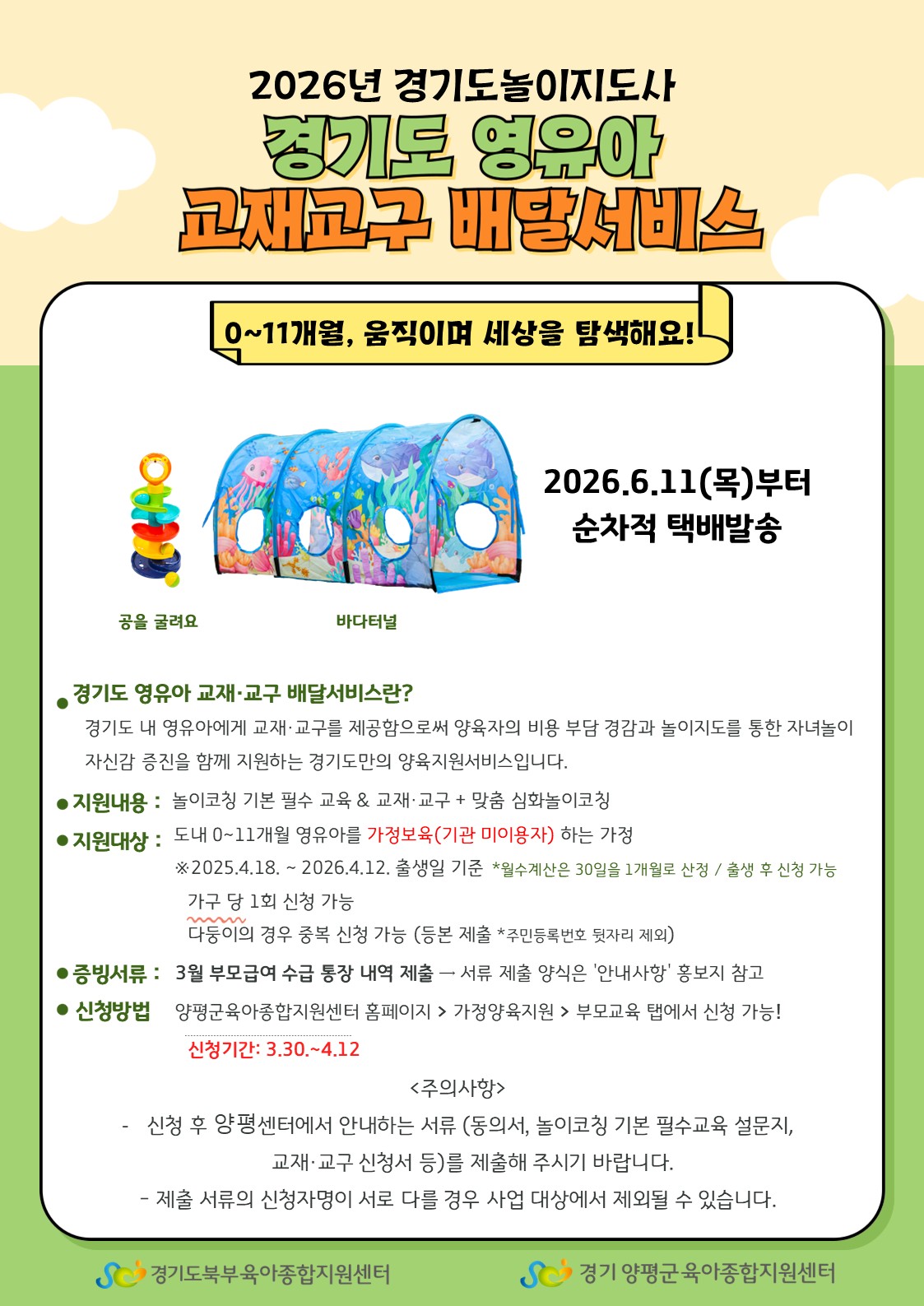 | 기타사항 | 관 내 거주 영유아에게 교재·교구를 제공함으로써 양육자의 비용 부담 경감과 놀이지도를 통한 자녀 놀이 자신감 증진을 함께 지원하는 경기도만의 양육지원 서비스입니다. | ||