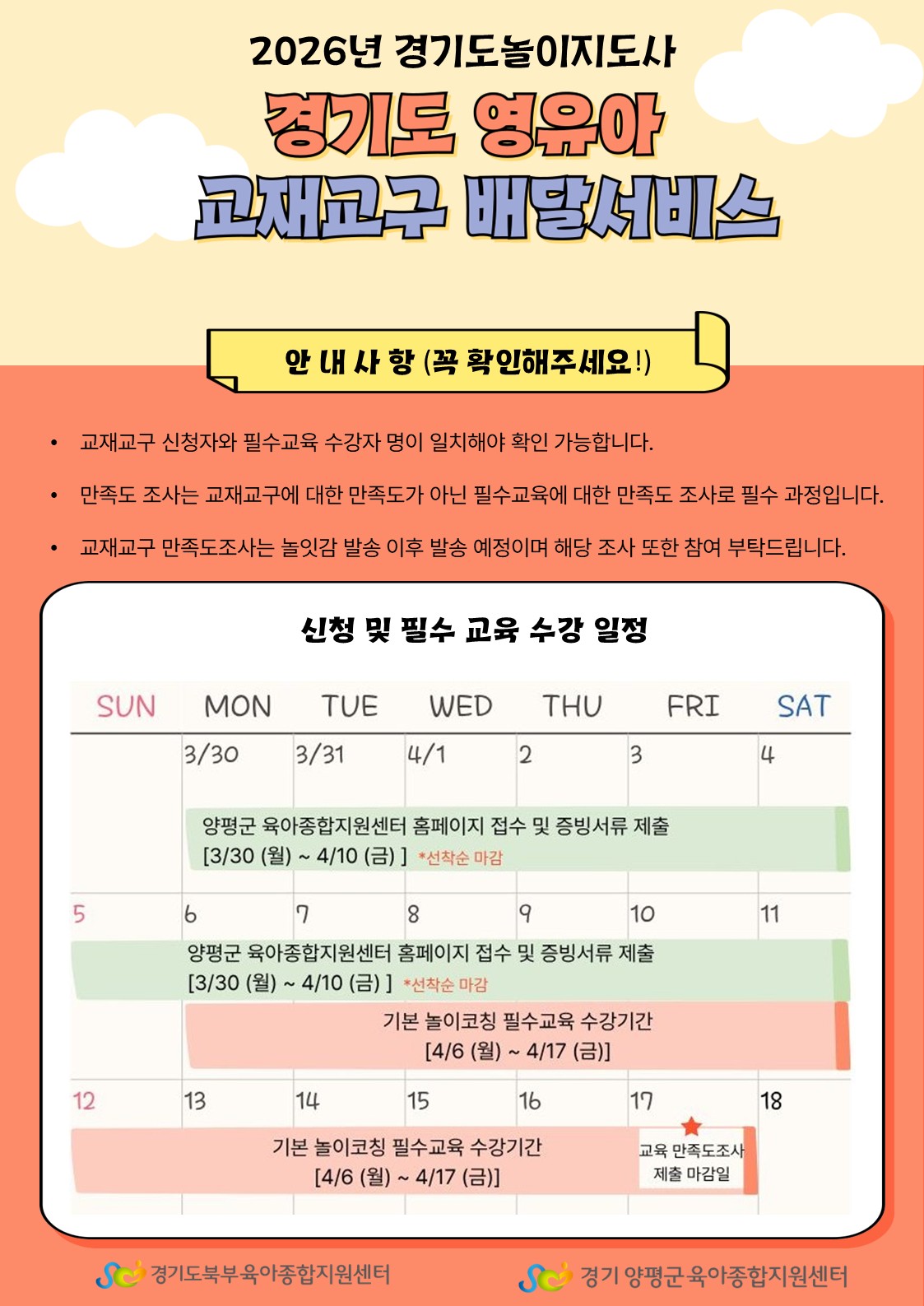 | 기타사항 | 관 내 거주 영유아에게 교재·교구를 제공함으로써 양육자의 비용 부담 경감과 놀이지도를 통한 자녀 놀이 자신감 증진을 함께 지원하는 경기도만의 양육지원 서비스입니다. | ||