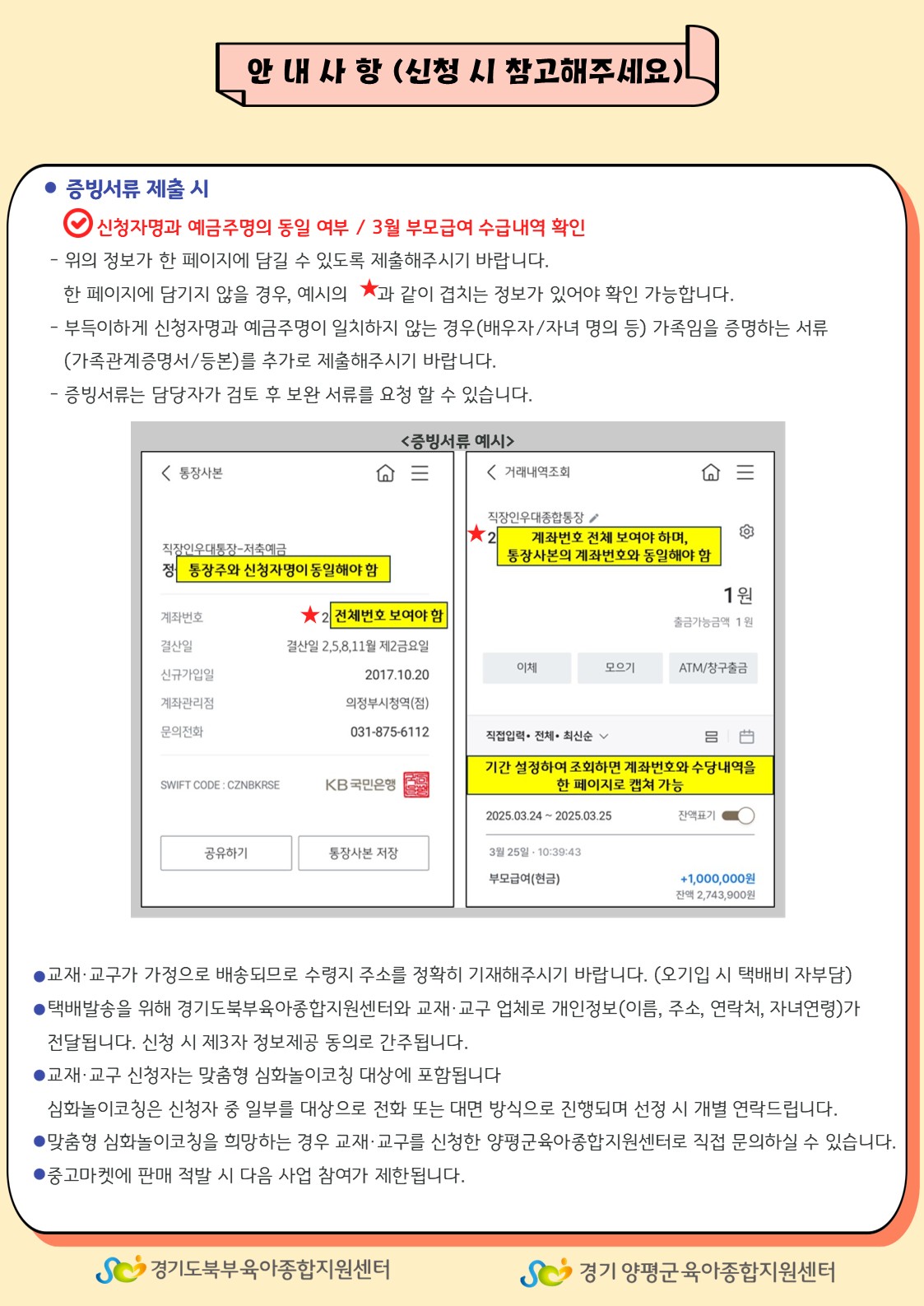 1. 신청자 대상 4/6 문자로 발송되는 구글폼으로 관련서류 회신 (~4/10까지) 2. 기본 놀이코칭 필수 교육 수강 후 교육에 대한 만족도조사 링크 회신 (~4/17까지) *개인정보동의서는 필수이며 비동의 시 신청이 불가합니다. 놀잇감 배송 건으로 인한 주소와 우편번호는 양식에 맞춰 정확하게 입력해주세요!