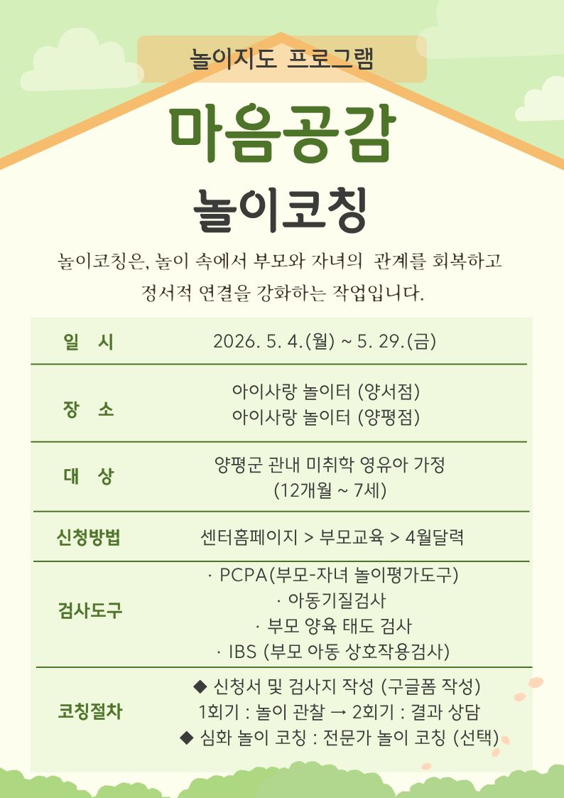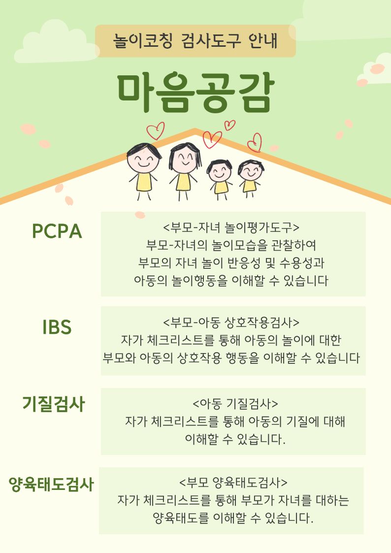 | 기타사항 | *놀이코칭을 신청하신 분께는 신청서 (구글폼)을 발송해드립니다. 신청서를 받으신 후 작성해주시면 일정과 검사도구 신청 조율을 위하여 개별연락 드립니다. | ||