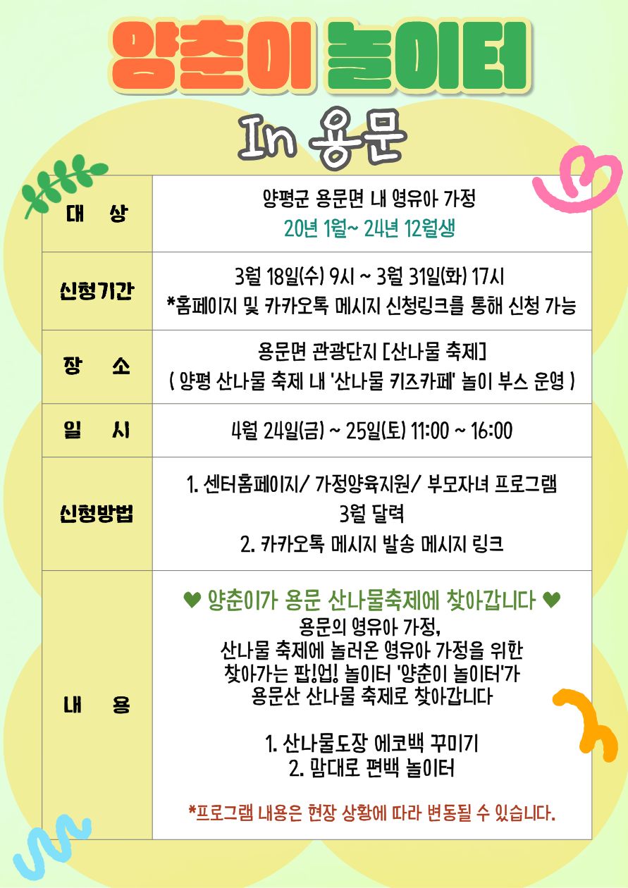| [놀이지도프로그램] 양춘이 놀이터 - 용문 산나물축제 | |||