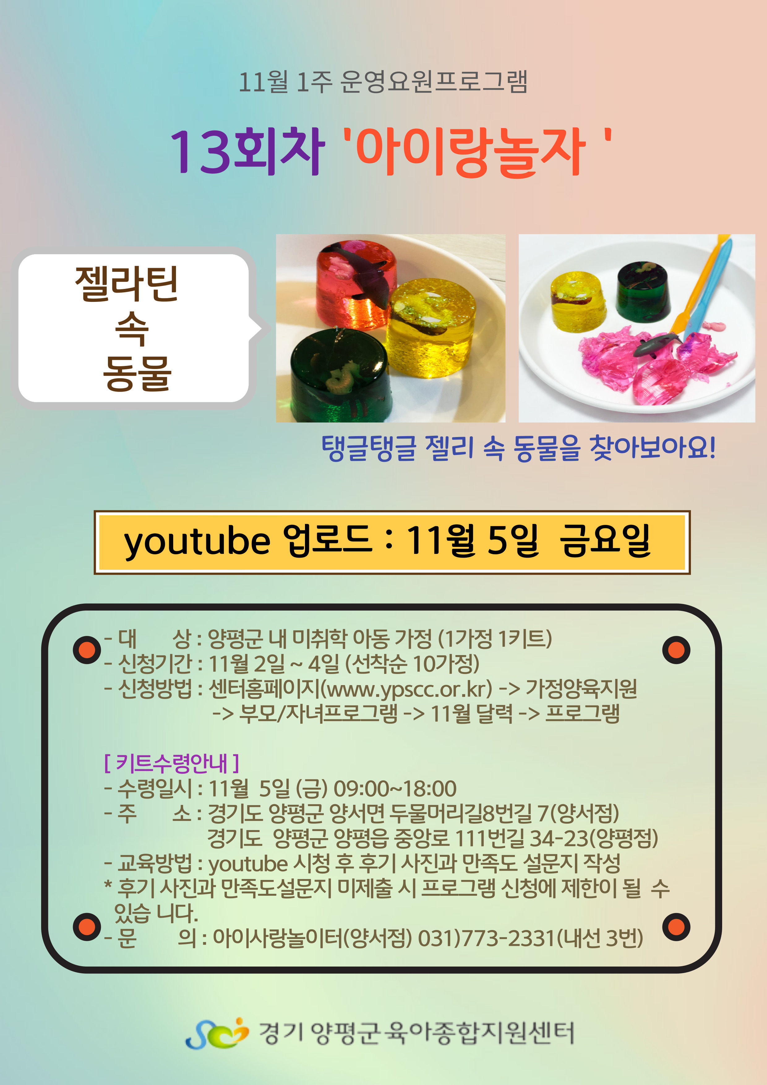 | [아이사랑놀이터 양서] 11월 1주 아이랑놀자 프로그램 젤리 속 동물 | |||
