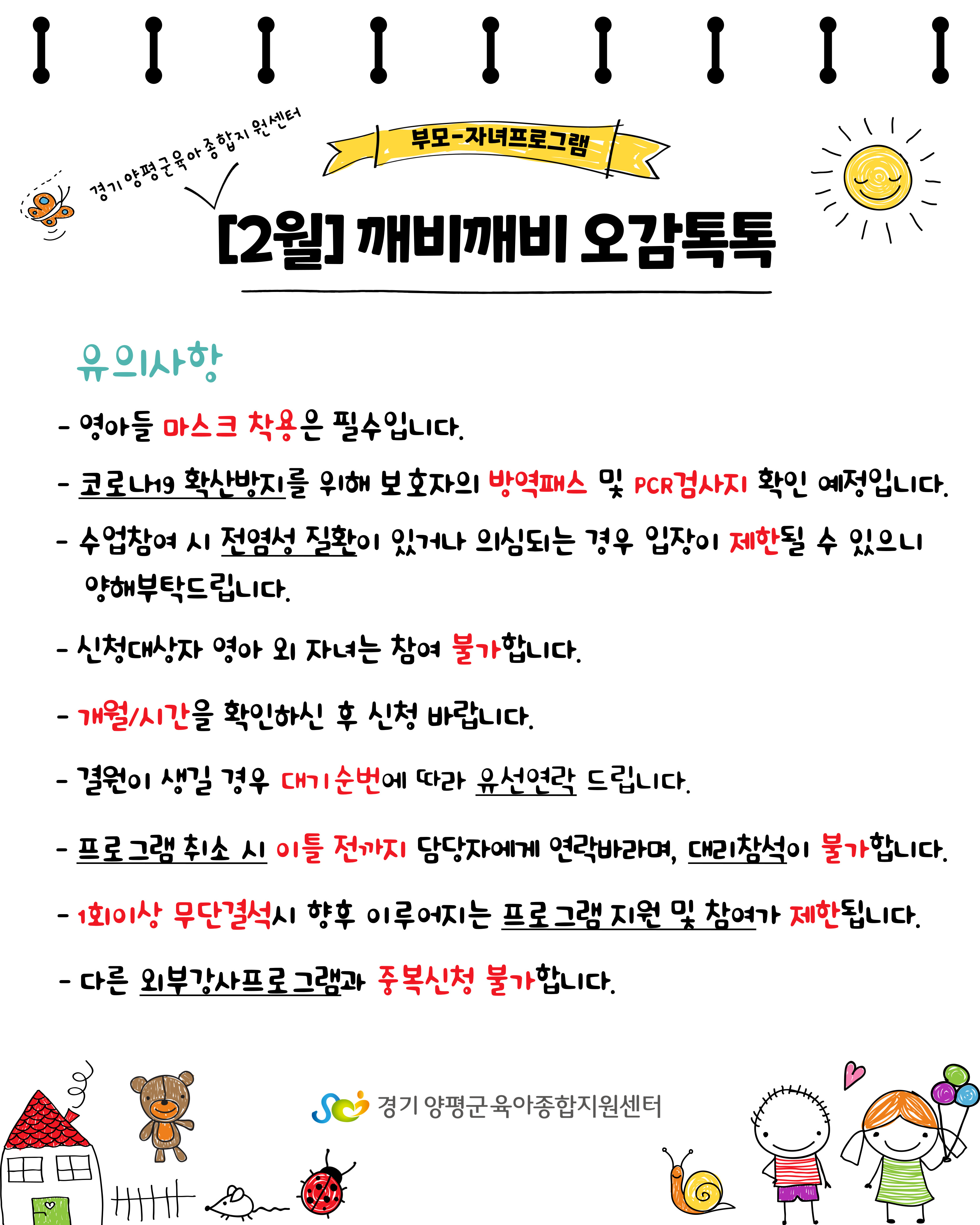 | 기타사항 | - 영아들 마스크 착용은 필수입니다. - 코로나19 확산방지를 위해 보호자의 방역패스 및 PCR검사지 확인 예정입니다. - 수업참여 시 전염성 질환이 있거나 의심되는 경우 입장이 제한될 수 있으니 양해부탁드립니다. - 개월/시간을 확인하신 후 신청 바랍니다. - 신청대상자 영아 외 자녀는 동반 불가합니다. - 결원이 생길 경우 대기 순번에 따라 유선연락 드립니다. - 프로그램 취소 시 이틀 전까지 담당자에게 연락바라며, 대리참석이 불가합니다. - 1회이상 무단결석 시 향후 이루어지는 프로그램에 지원 및 참여가 제한됩니다. - 다른 외부강사프로그램과 중복하여 신청할 수 없습니다. |