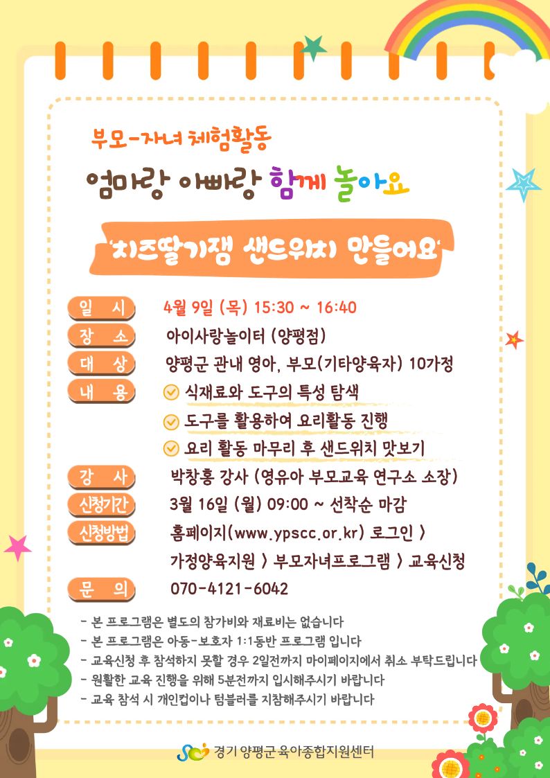 | 엄마랑 아빠랑 함께 놀아요 [치즈딸기잼 샌드위치 만들어요] 18개월~36개월 (오후) | |||