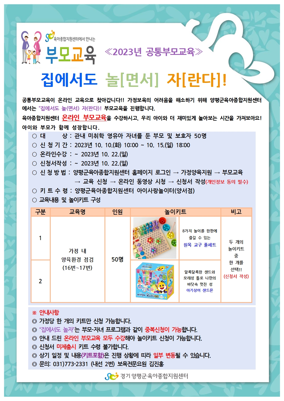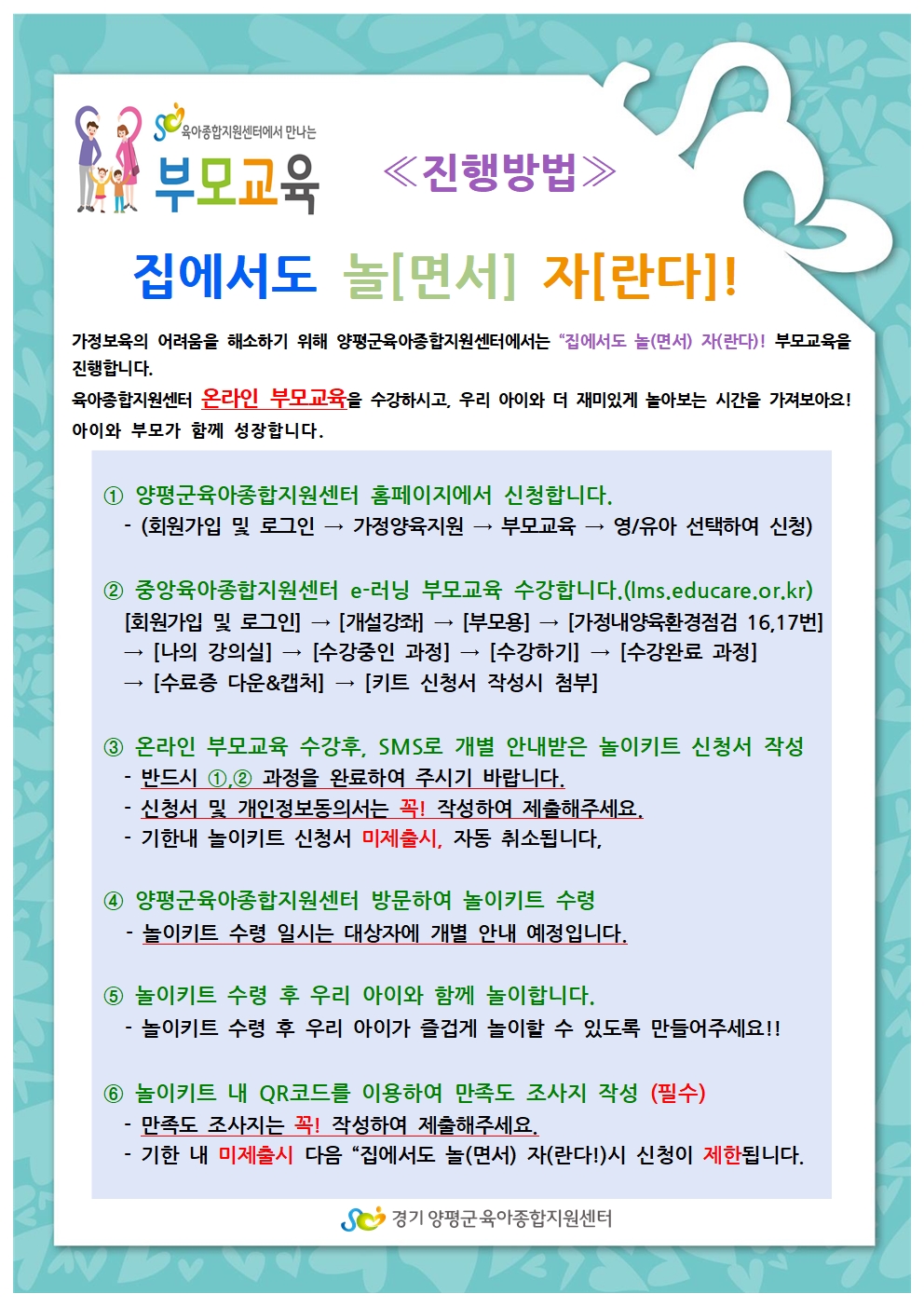 기타사항 | ◎ 가정당 한 개의 키트만 신청 가능합니다. ◎ “집에서도 놀자”는 부모-자녀 프로그램과 같이 중복신청이 가능합니다. ◎ 안내 드린 온라인 부모교육 모두 수강해야 놀이키트 신청이 가능합니다. ◎ 신청서 미제출시 키트 수령 불가합니다. ◎ 상기 일정 및 내용(키트포함)은 진행 상황에 띠라 일부 변동될 수 있습니다. |