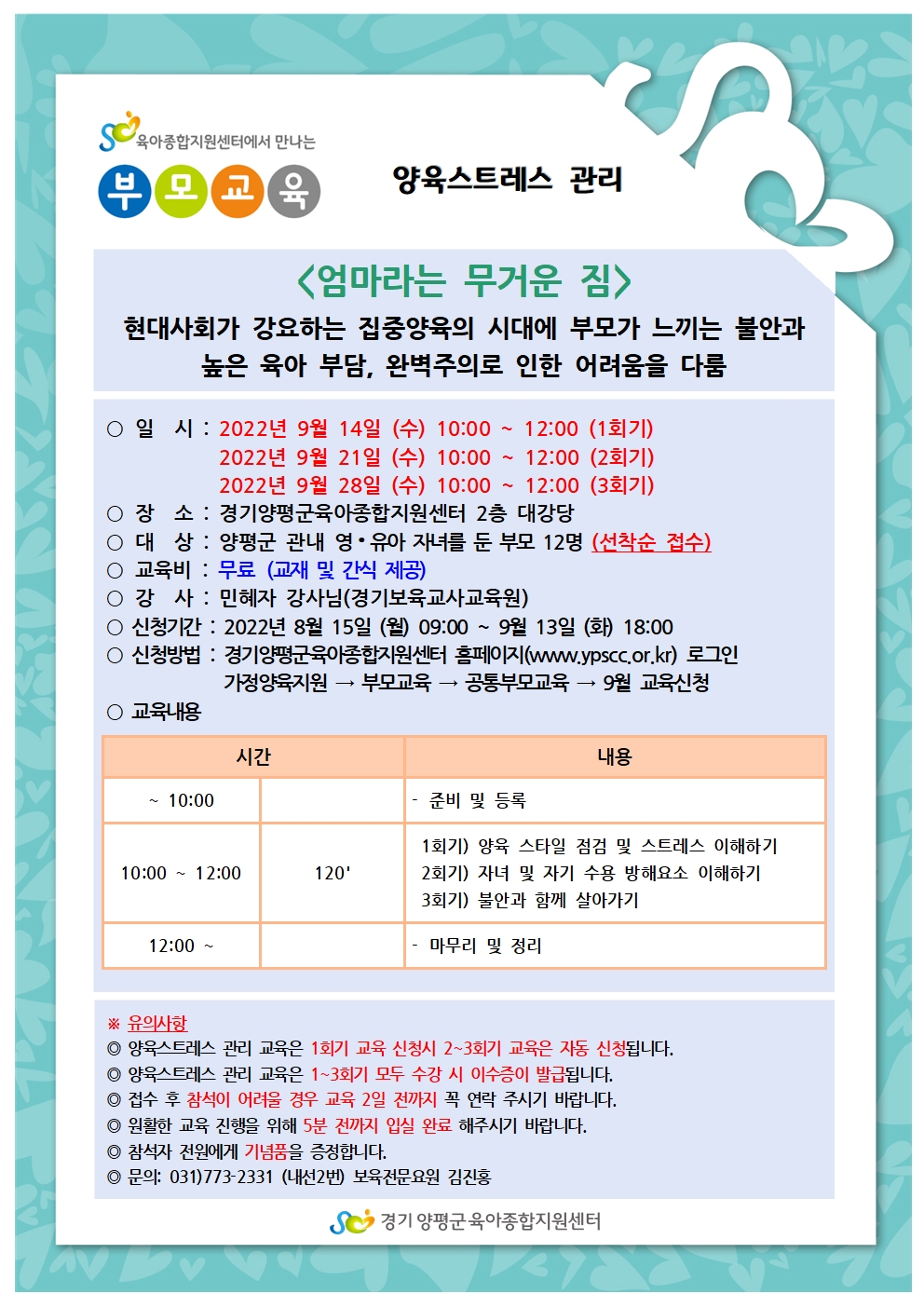| 기타사항 | ◎ 양육스트레스 관리 교육은 1회기 교육 신청시 2~3회기 교육은 자동 신청됩니다. ◎ 양육스트레스 관리 교육은 1~3회기 모두 수강 시 이수증이 발급됩니다. ◎ 접수 후 참석이 어려울 경우 교육 2일 전까지 꼭 연락 주시기 바랍니다. ◎ 원활한 교육 진행을 위해 5분 전까지 입실 완료 해주시기 바랍니다. ◎ 참석자 전원에게 기념품을 증정합니다. |
