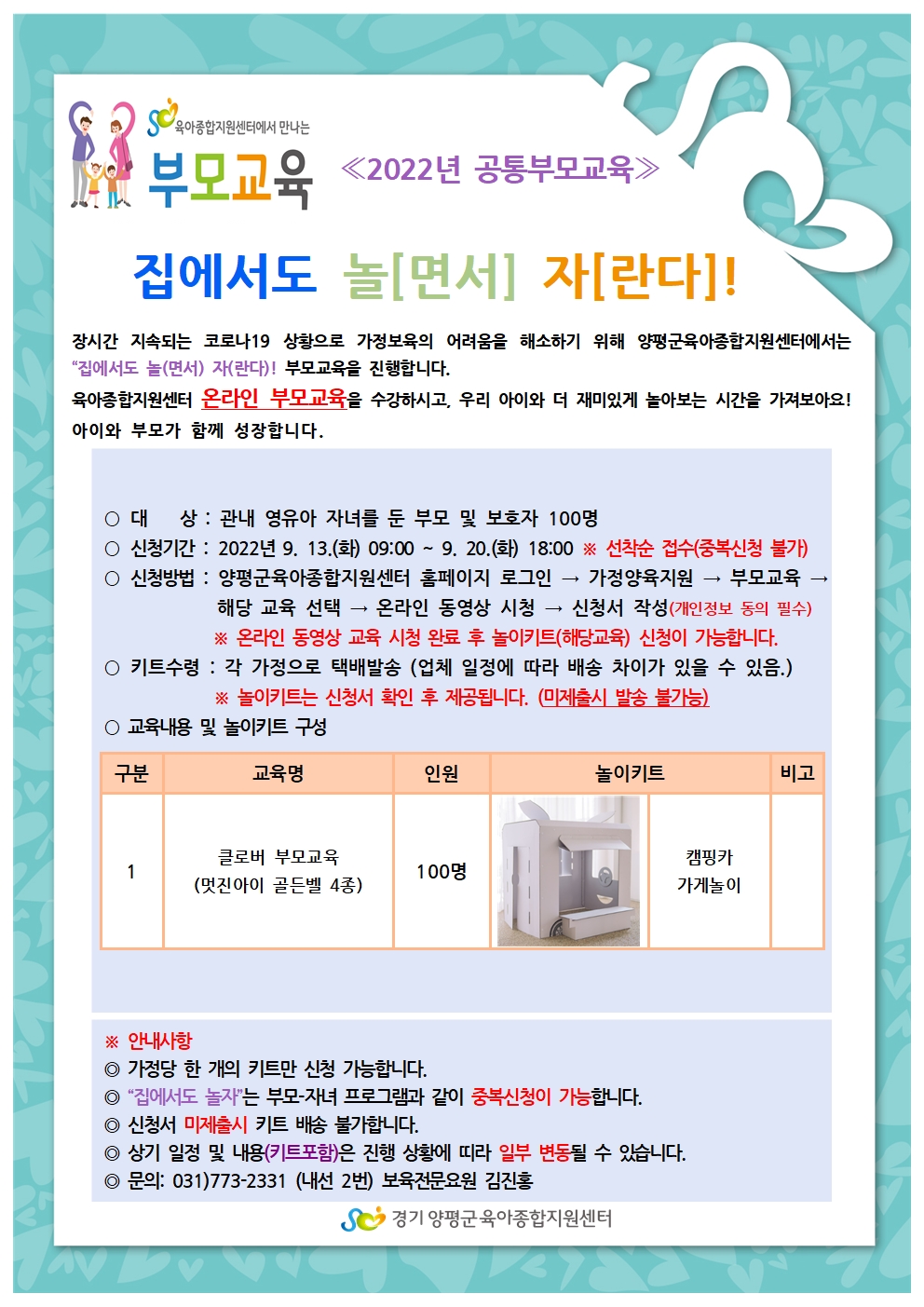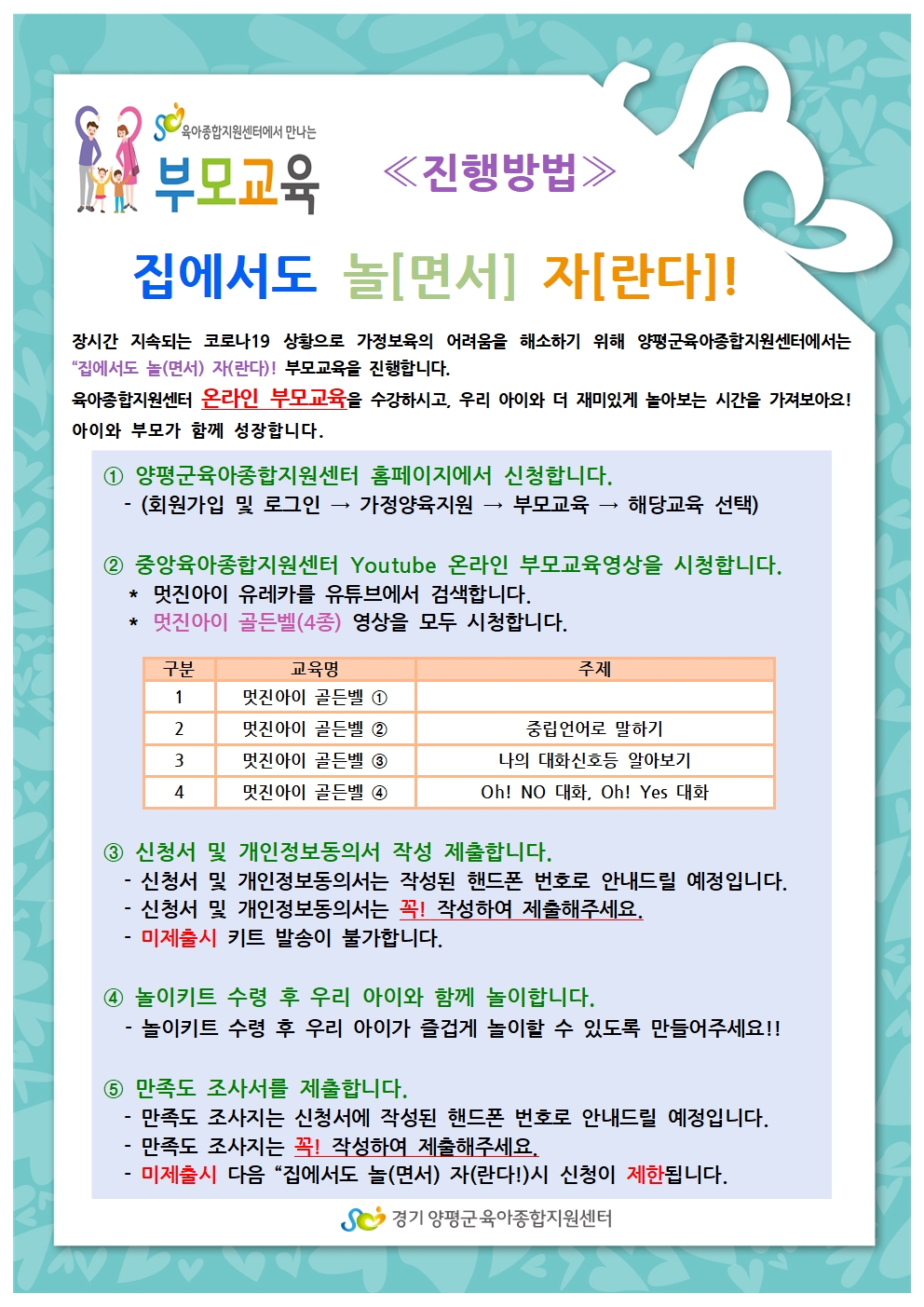 | 기타사항 | ◎ 가정당 한 개의 키트만 신청 가능합니다. ◎ “집에서도 놀자”는 부모-자녀 프로그램과 같이 중복신청이 가능합니다. ◎ 신청서 미제출시 키트 배송 불가합니다. ◎ 상기 일정 및 내용(키트포함)은 진행 상황에 띠라 일부 변동될 수 있습니다. |