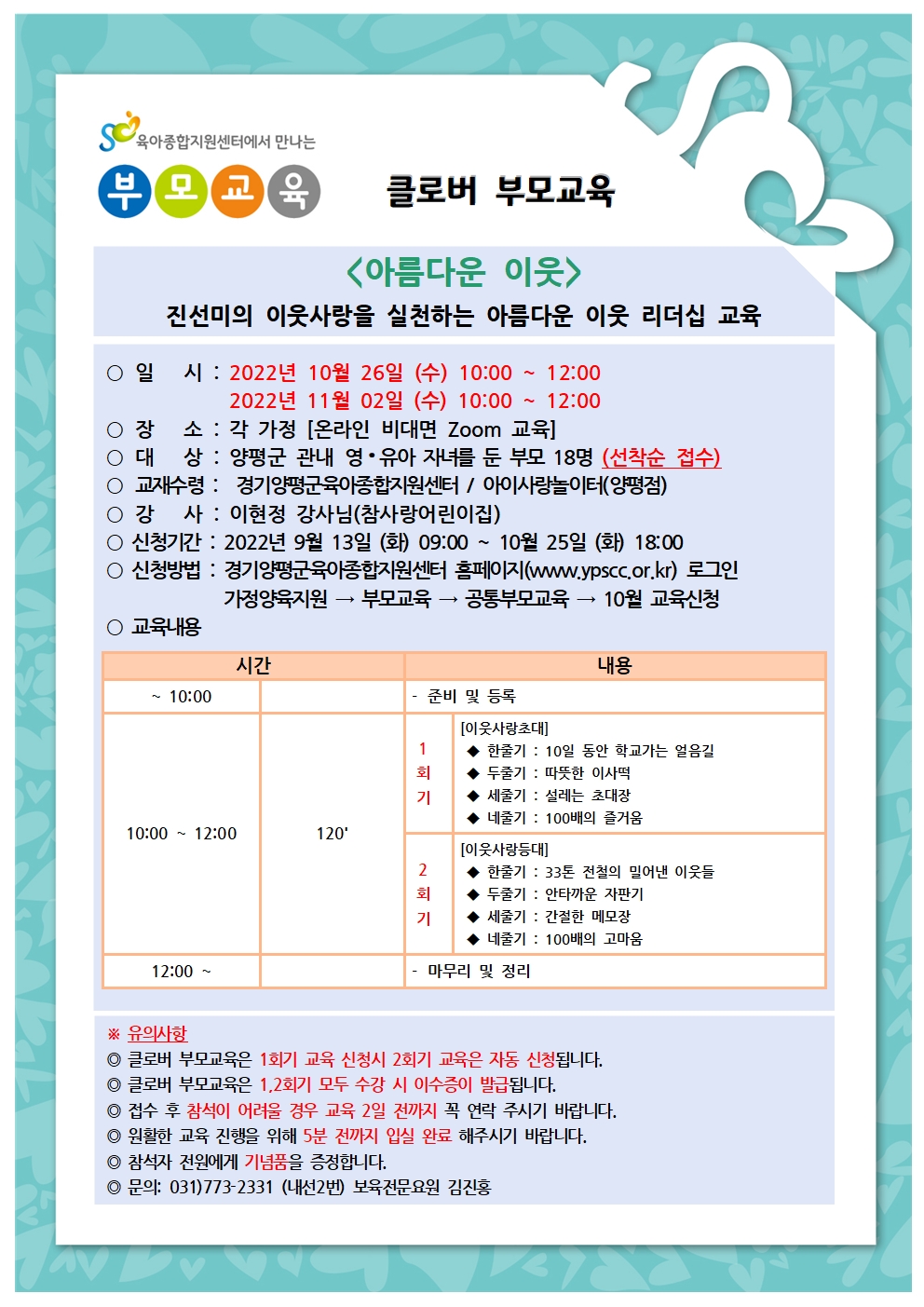 | 기타사항 | ◎ 클로버 부모교육은 1회기 교육 신청시 2회기 교육은 자동 신청됩니다. ◎ 교육일자 확인하여 주시기 바라며, 1,2회기 모두 참석 가능하시면 신청하여 주시기 바랍니다. ◎ 클로버 부모교육은 1,2회기 모두 수강 시 이수증이 발급됩니다. ◎ 접수 후 참석이 어려울 경우 교육 2일 전까지 꼭 연락 주시기 바랍니다. ◎ 원활한 교육 진행을 위해 5분 전까지 입실 완료 해주시기 바랍니다. ◎ 참석자 전원에게 기념품을 증정합니다. |