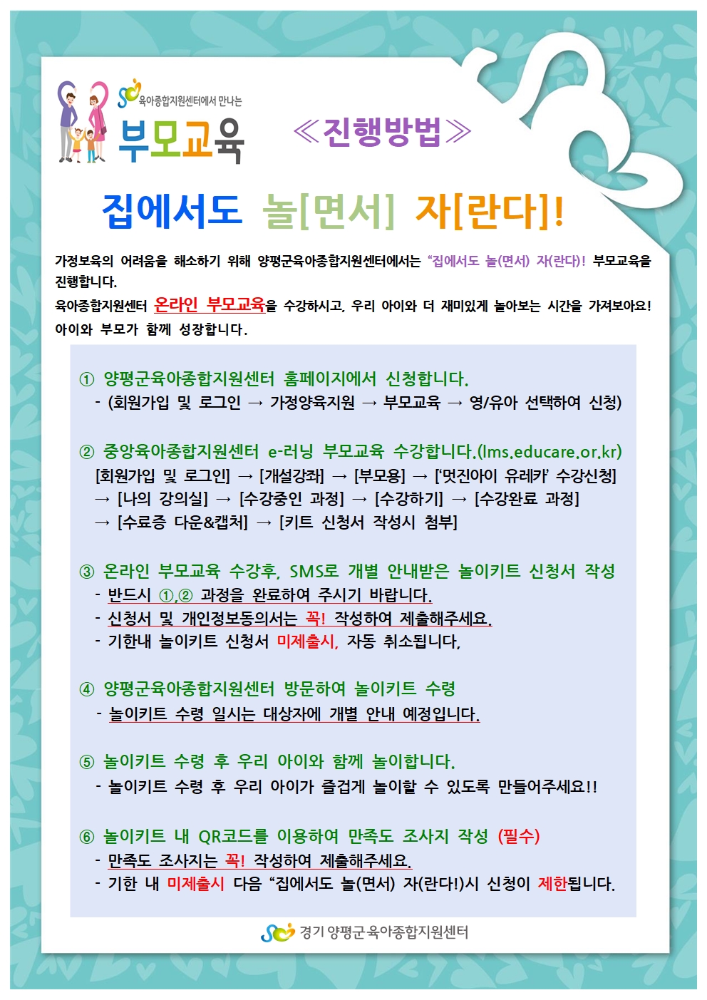 | 기타사항 | ◎ 가정당 한 개의 키트만 신청 가능합니다. ◎ “집에서도 놀자”는 부모-자녀 프로그램과 같이 중복신청이 가능합니다. ◎ 신청서 미제출시 키트 수령 불가합니다. ◎ 상기 일정 및 내용(키트포함)은 진행 상황에 띠라 일부 변동될 수 있습니다. ◎ 문의: 031)773-2331 (내선 2번) 보육전문요원 김진홍 |