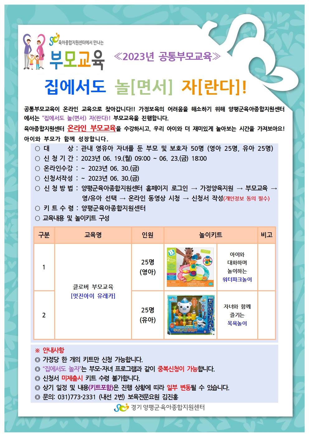 | 기타사항 | ◎ 가정당 한 개의 키트만 신청 가능합니다. ◎ “집에서도 놀자”는 부모-자녀 프로그램과 같이 중복신청이 가능합니다. ◎ 신청서 미제출시 키트 수령 불가합니다. ◎ 상기 일정 및 내용(키트포함)은 진행 상황에 띠라 일부 변동될 수 있습니다. ◎ 문의: 031)773-2331 (내선 2번) 보육전문요원 김진홍 |
