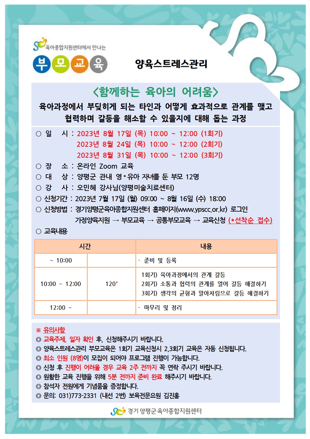 | 기타사항 | ◎ 교육주제, 일자 확인 후, 신청해주시기 바랍니다. ◎ 양육스트레스관리 부모교육은 1회기 교육신청시 2,3회기 교육은 자동 신청됩니다. ◎ 최소 인원 (8명)이 모집이 되어야 프로그램 진행이 가능합니다. ◎ 신청 후 진행이 어려울 경우 교육 2주 전까지 꼭 연락 주시기 바랍니다. ◎ 원활한 교육 진행을 위해 5분 전까지 준비 완료 해주시기 바랍니다. ◎ 참석자 전원에게 기념품을 증정합니다. |