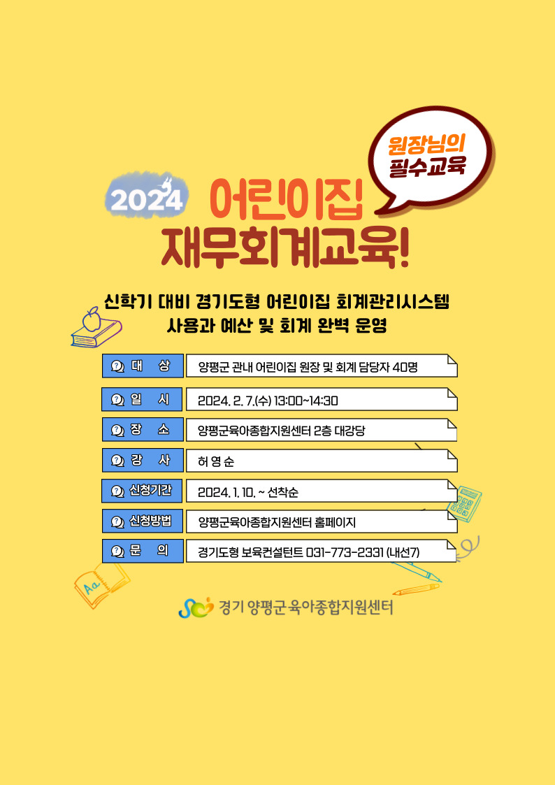 | 기타사항 | 2024년 상반기 재무회계교육으로 평가제 원장 필수 교육입니다. 신학기 대비 예결산서 수립을 위해 적극 참여부탁드립니다. |